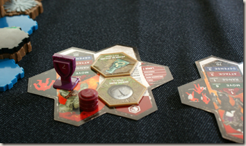 雙方都有四個紫色的塑膠立牌,用來秘密排列角色的移動順序。